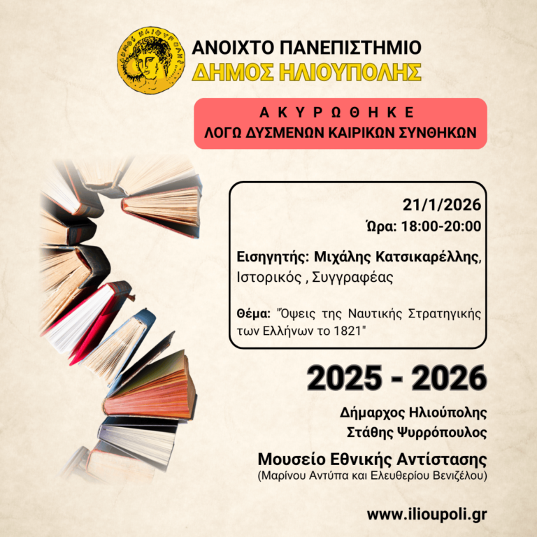 Ενημερώνουμε τους Δημότες & Κατοίκους ότι προγραμματισμένη 8η ομιλία του Ανοιχτού Πανεπιστημίου για σήμερα Τετάρτη 21 Ιανουαρίου 2026 και ώρα 18:00-20:00, στο Μουσείο Εθνικής Αντίστασης (Μαρίνου Αντύπα και