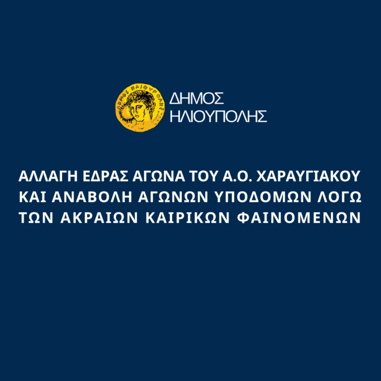 Ενημερώνουμε τους Δημότες και Κατοίκους Ηλιούπολης ότι μετά από τα ακραία καιρικά φαινόμενα της Τετάρτης 21 Ιανουαρίου 2026 δεν είναι δυνατό να διεξαχθούν αγώνες στο