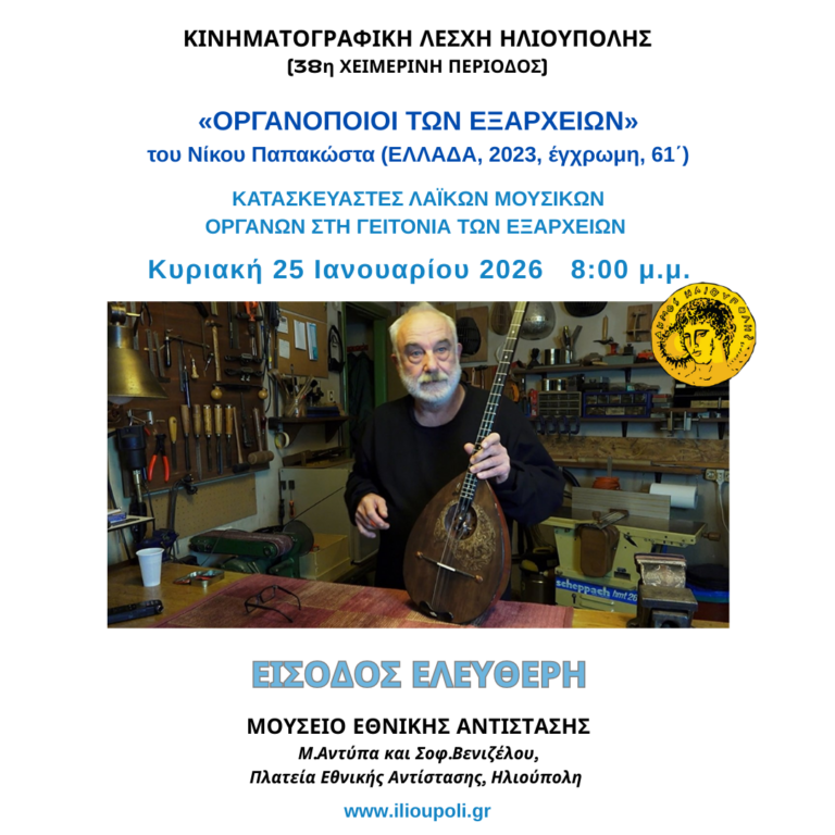 «ΟΡΓΑΝΟΠΟΙΟΙ ΤΩΝ ΕΞΑΡΧΕΙΩΝ» του Νίκου Παπακώστα (ΕΛΛΑΔΑ, 2023, έγχρωμη, 61΄) ΚΑΤΑΣΚΕΥΑΣΤΕΣ ΛΑΪΚΩΝ ΜΟΥΣΙΚΩΝ ΟΡΓΑΝΩΝ ΣΤΗ ΓΕΙΤΟΝΙΑ ΤΩΝ ΕΞΑΡΧΕΙΩΝ Η Κινηματογραφική Λέσχη Ηλιούπολης σας προσκαλεί στην προβολή