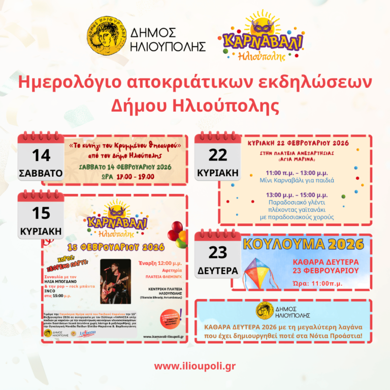 O Δήμος Ηλιούπολης τιμά τις παραδόσεις και σας προσκαλεί την Καθαρά Δευτέρα 23 Φεβρουαρίου 2026 και ώρα 11:00 π.μ., να συμμετάσχετε στη γιορτή για τα ΚΟΥΛΟΥΜΑ 2026, που θα
