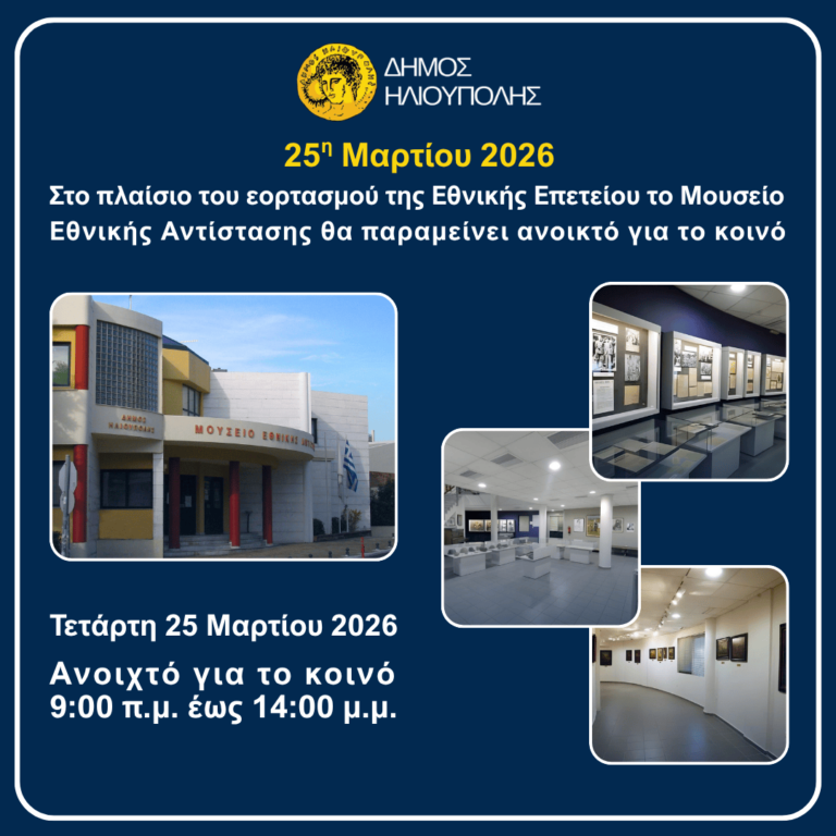 Εκδήλωση του Δήμου Ηλιούπολης και της Δημοτικής Επιτροπής Ισότητας με θέμα «Η Συμβολή των Γυναικών στην Ελληνική Επανάσταση» την Κυριακή 22 Μαρτίου 2026 στις 18:30 μ.μ. στο Μουσείο Εθνικής Αντίστασης
