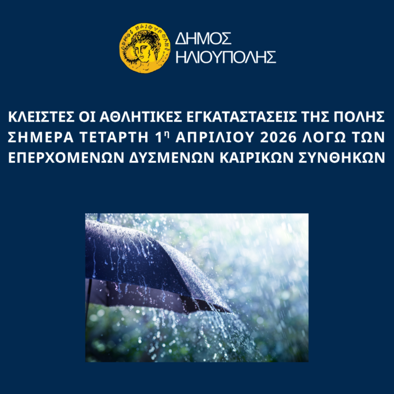 Ενημερώνουμε τους Δημότες & Κατοίκους ότι οι αθλητικές εγκαταστάσεις θα παραμείνουν κλειστές σήμερα Τετάρτη 1η Απριλίου 2026 από τις 15:00 μ.μ., λόγω επικίνδυνων καιρικών φαινομένων.
