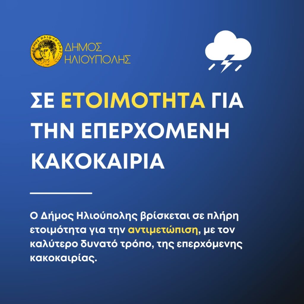 Ο ΔΗΜΟΣ ΗΛΙΟΥΠΟΛΗΣ ΒΡΙΣΚΕΤΑΙ ΣΕ ΠΛΗΡΗ ΕΤΟΙΜΟΤΗΤΑ ΓΙΑ ΤΗΝ ΑΝΤΙΜΕΤΩΠΙΣΗ, ΜΕ ΤΟΝ ΚΑΛΥΤΕΡΟ ΔΥΝΑΤΟ ΤΡΟΠΟ, ΤΗΣ ΕΠΕΡΧΟΜΕΝΗΣ ΚΑΚΟΚΑΙΡΙΑΣ
