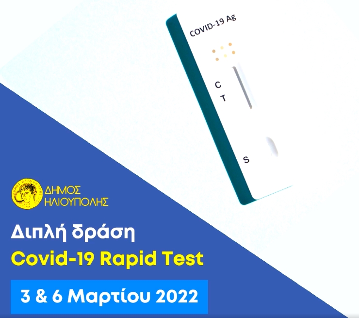Νέες δράσεις μαζικού ελέγχου ταχείας ανίχνευσης «Covid-19 Rapid Test» από κλιμάκιο του ΕΟΔΥ, την Πέμπτη 3 Μαρτίου και την Κυριακή 6 Μαρτίου 2022 από 09:30 έως 14:30, στην Αίθουσα Συνεδριάσεων Δημοτικού Συμβουλίου «Κώστας Κονδύλης», με είσοδο από Σοφοκλή Βενιζέλου 114.