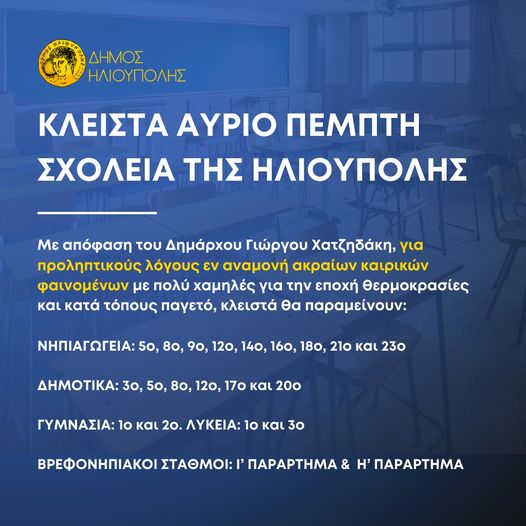 Με απόφαση του Δημάρχου Γιώργου Χατζηδάκη, για προληπτικούς λόγους εν αναμονή ακραίων καιρικών φαινομένων με πολύ χαμηλές για την εποχή θερμοκρασίες και κατά τόπους παγετό, κλειστά θα παραμείνουν αύριο Πέμπτη 10 Μαρτίου 2022, τα σχολεία που βρίσκονται στις πιο δυσπρόσιτες περιοχές της πόλης και συγκεκριμένα τα παρακάτω: