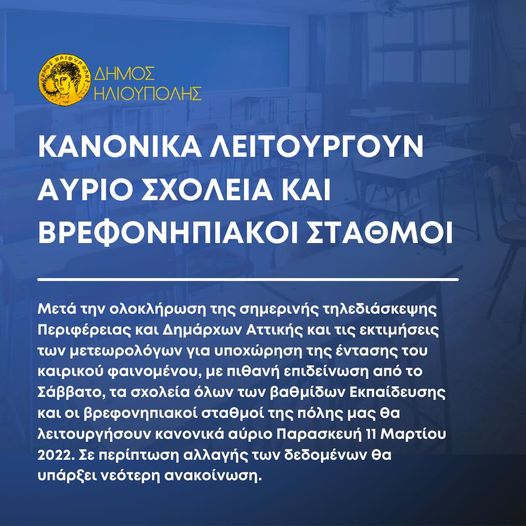 Μετά την ολοκλήρωση της σημερινής τηλεδιάσκεψης Περιφέρειας και Δημάρχων Αττικής και τις εκτιμήσεις των μετεωρολόγων για υποχώρηση της έντασης του καιρικού φαινομένου με πιθανή επιδείνωση από το Σάββατο, τα σχολεία όλων των βαθμίδων Εκπαίδευσης και οι βρεφονηπιακοί σταθμοί της πόλης μας θα λειτουργήσουν κανονικά αύριο Παρασκευή 11 Μαρτίου 2022.