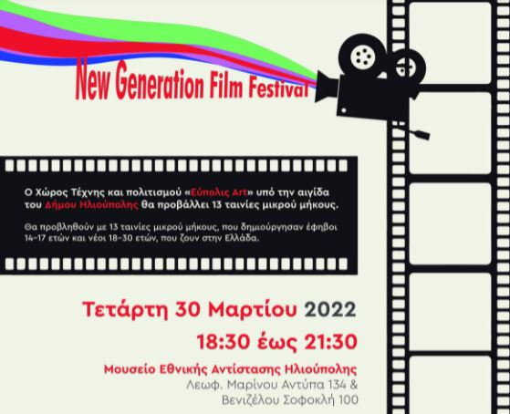 Υπό την αιγίδα του Δήμου Ηλιούπολης και του «Πολυχώρου Τέχνης και Πολιτισμού Εύπολις Art», πραγματοποιείται την Τετάρτη 30 Μαρτίου 2022 το «New Generation Film Festival», στο Μουσείο Εθνικής Αντίστασης Ηλιούπολης, Λεωφ. Μαρίνου Αντύπα 134 & Βενιζέλου Σοφοκλή 100, από 18:30 έως 21:30, με ελεύθερη είσοδο.