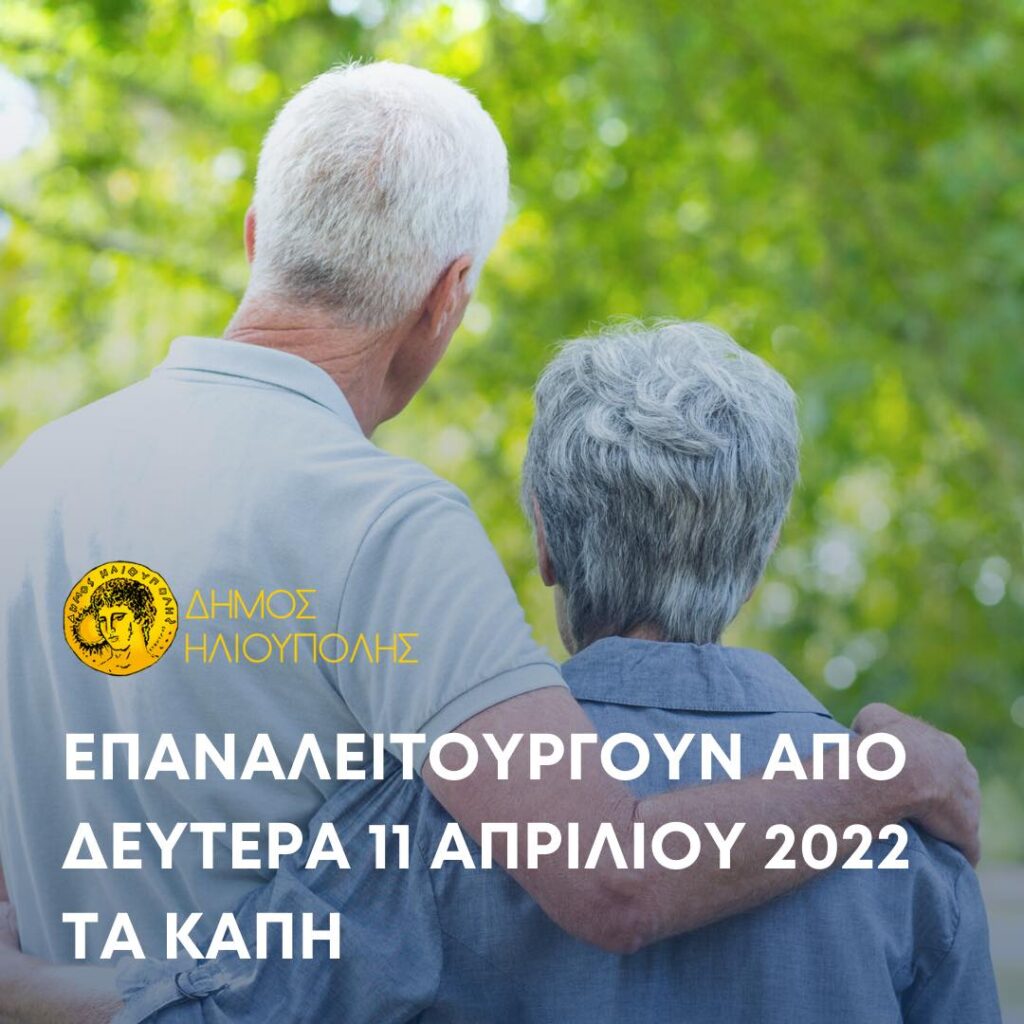 Από την Δευτέρα 11 Απριλίου 2022 επαναλειτουργούν τα «Παραρτήματα Κοινωνικής Αλληλεγγύης» (ΚΑΠΗ) της Ηλιούπολης, μετά από σχετική απόφαση της Διοίκησης του «Κέντρου Αγωγής και Φροντίδας του Δήμου Ηλιούπολης» – «ΚΑΦΑΔΗΛ». Για την ασφαλή λειτουργία τους και για λόγους προσωπικής προστασίας του προσωπικού και των μελών των ΚΑΠΗ σε όλες τις δραστηριότητες θα συμμετέχουν μόνο οι […]