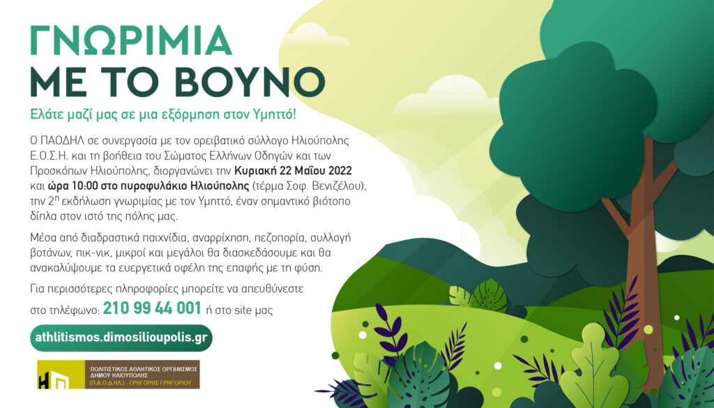 Ο Πολιτιστικός Αθλητικός Οργανισμός Δήμου Ηλιούπολης – ΠΑΟΔΗΛ διοργανώνει, σε συνεργασία με τον Ορειβατικό Σύλλογο Ηλιούπολης – ΕΟΣΗ, την υποστήριξη του Σώματος Ελλήνων Οδηγών και των Προσκόπων Ηλιούπολης, τη δεύτερη εκδήλωση γνωριμίας με τον Υμηττό, την Κυριακή 22 Μαΐου 2022, στις 10:00, στο Πυροφυλάκιο Ηλιούπολης στο τέρμα Σοφοκλή Βενιζέλου. Στόχος είναι η γνωριμία με τον […]