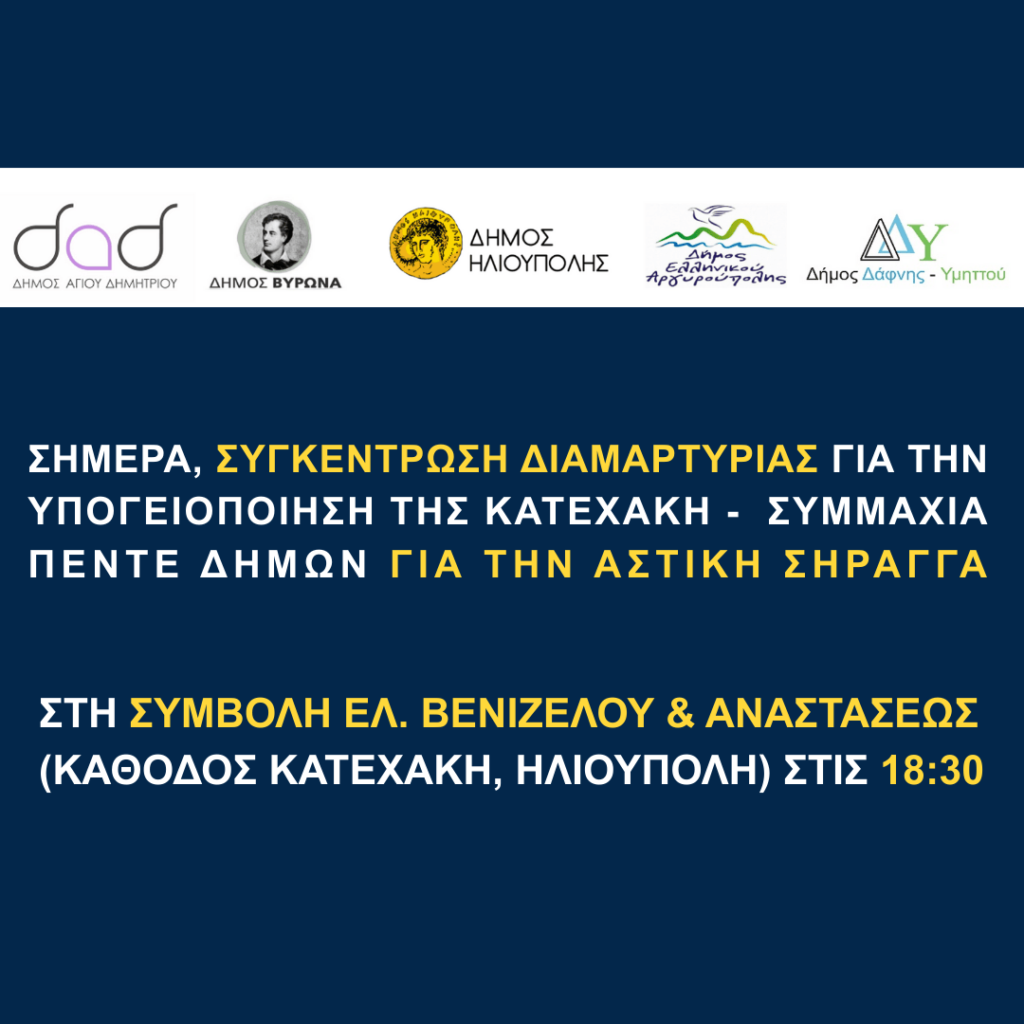 ΣΗΜΕΡΑ, ΣΥΓΚΕΝΤΡΩΣΗ ΔΙΑΜΑΡΤΥΡΙΑΣ ΓΙΑ ΤΗΝ ΥΠΟΓΕΙΟΠΟΙΗΣΗ ΤΗΣ ΚΑΤΕΧΑΚΗ – ΣΥΜΜΑΧΙΑ ΠΕΝΤΕ ΔΗΜΩΝ ΓΙΑ ΤΗΝ ΑΣΤΙΚΗ ΣΗΡΑΓΓΑ