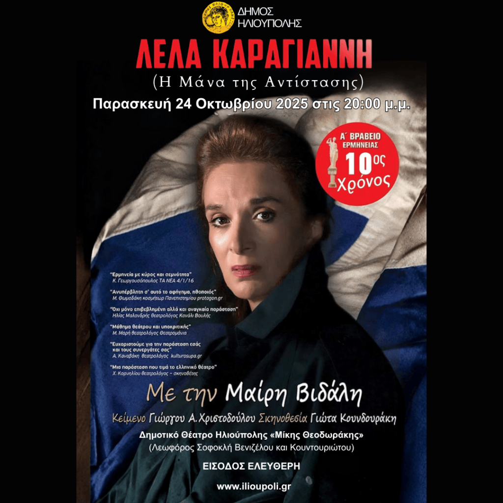 ΕΛΕΥΘΕΡΗ ΕΙΣΟΔΟΣ Ο Δήμος Ηλιούπολης σας προσκαλεί στην θεατρική παράσταση με τίτλο «ΛΕΛΑ ΚΑΡΑΓΙΑΝΝΗ Η Μάνα της Αντίστασης» που θα πραγματοποιηθεί με Ελεύθερη Είσοδο την Παρασκευή 24 Οκτωβρίου 2025 στις 20:00 μ.μ. στο Δημοτικό Θέατρο Ηλιούπολης «Μίκης Θεοδωράκης» (Λεωφόρος Σοφοκλή Βενιζέλου και Κουντουριώτου) στο Δημαρχείο της Ηλιούπολης. Η Λέλα Καραγιάννη θεωρείται η κορυφαία κατοχική ηρωίδα της […]