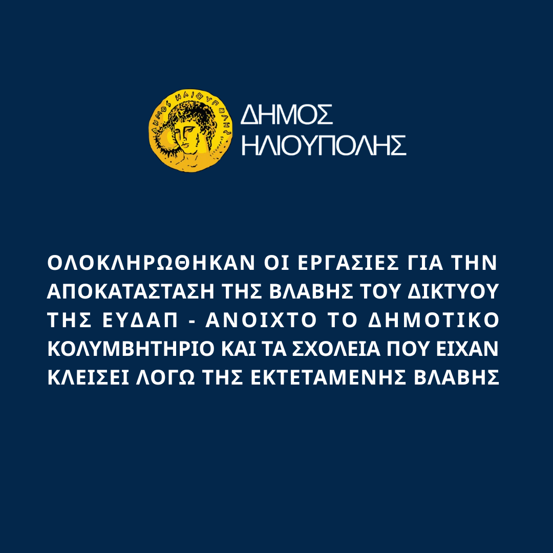Σε πλήρη λειτουργία το Δημοτικό Κολυμβητήριο Ηλιούπολης, το 8ο και 17ο Δημοτικού Σχολείο, το 2ου Γυμνάσιο, το 8ο και 21ο Νηπιαγωγείο και το Ι’ Παράρτημα Αγωγής μετά την αποκατάσταση της εκτεταμένης βλάβης της ΕΥΔΑΠ που παρουσιάστηκε την Τρίτη 4 Νοεμβρίου 2025.