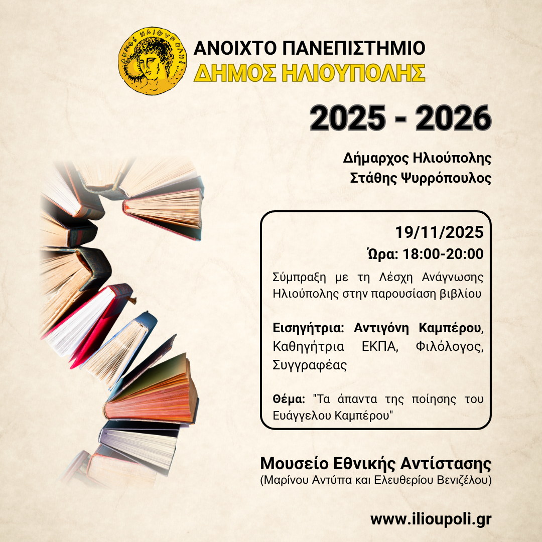 2η ομιλία του Ανοιχτού Πανεπιστημίου την Τετάρτη 19 Νοεμβρίου 2025 και ώρα 18:00-20:00, στο Μουσείο Εθνικής Αντίστασης (Μαρίνου Αντύπα και Ελευθερίου Βενιζέλου) με Εισηγήτρια: Αντιγόνη Καμπέρου, Καθηγήτρια ΕΚΠΑ, Φιλόλογος, Συγγραφέας και θέμα: «Τα άπαντα της ποίησης του Ευάγγελου Καμπέρου».