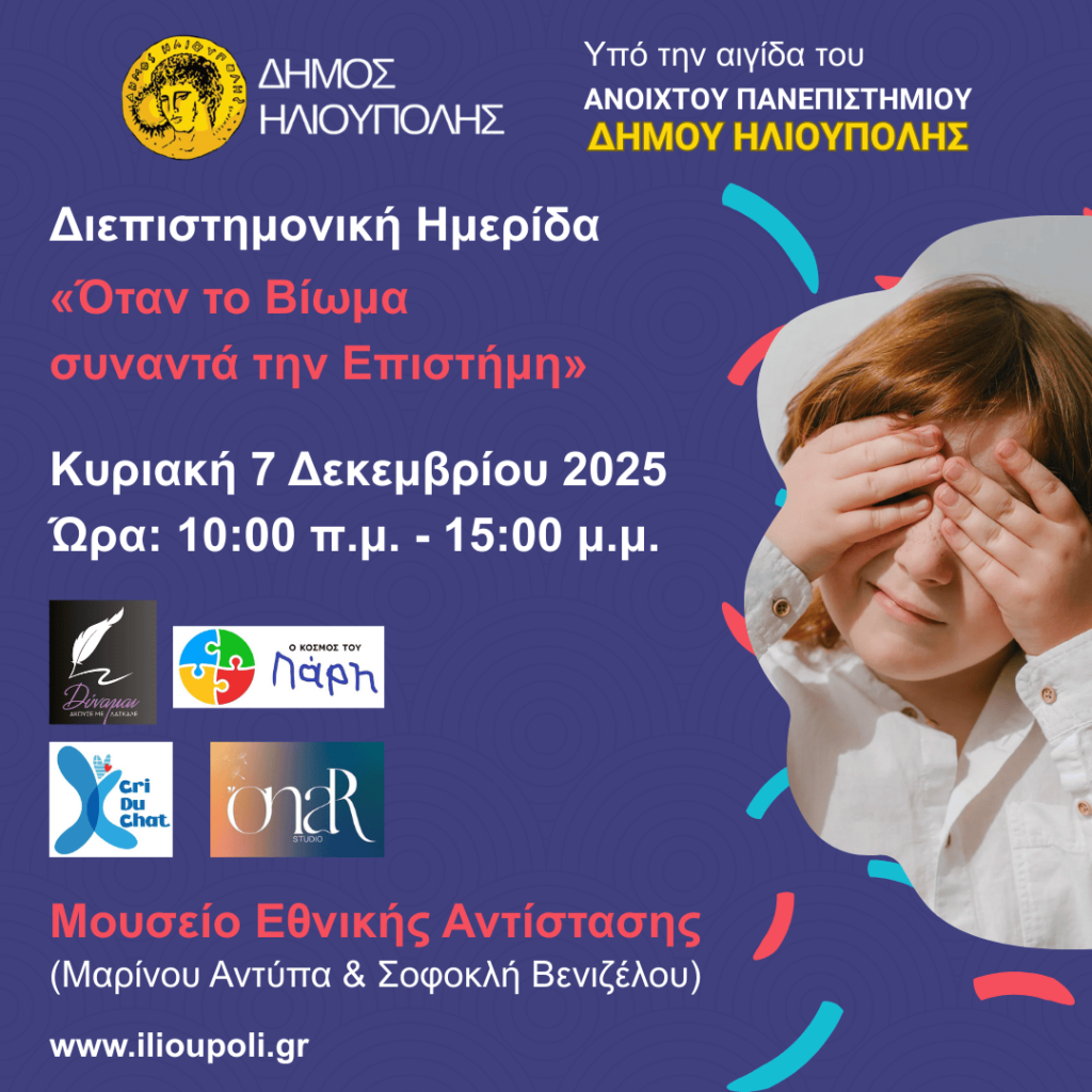 Οι φορείς “Δύναμαι, άκουσέ με”, “Ο Κόσμος του Πάρη”, “Cri du chat Greece” και “Onar studio”, με την υποστήριξη του Δήμου Ηλιούπολης και υπό την αιγίδα του ΑΝΟΙΧΤΟΥ ΠΑΝΕΠΙΣΤΗΜΙΟΥ ΔΗΜΟΥ ΗΛΙΟΥΠΟΛΗΣ σας προσκαλούν στη Διεπιστημονική Ημερίδα με θεματική: “ΔΕΠ-Υ και Αυτισμός” μέσα από την επιστημονική γνώση και το ανθρώπινο βίωμα, που θα πραγματοποιηθεί την: Κυριακή, […]