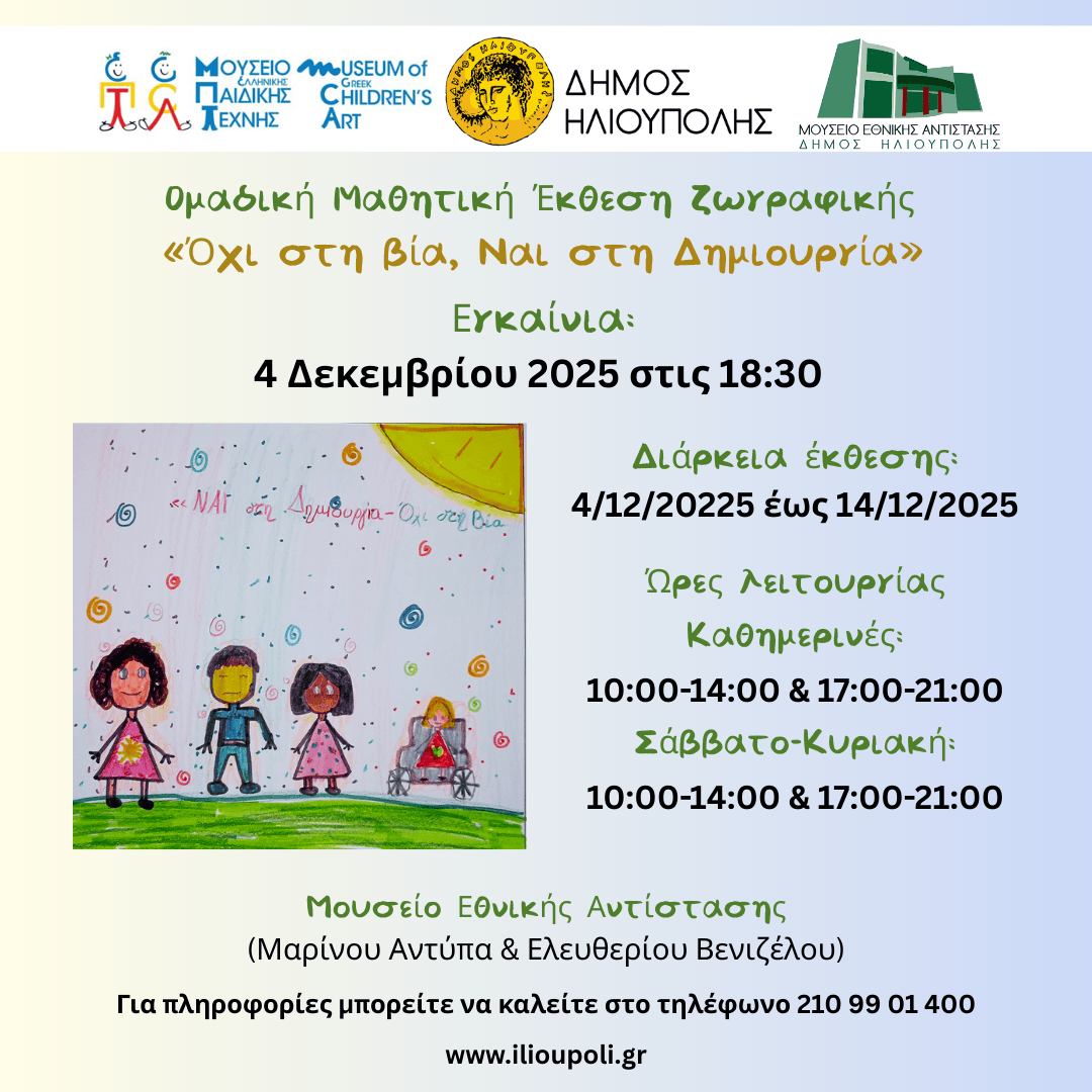 Σας προσκαλούμε στα εγκαίνια της ομαδικής έκθεσης ζωγραφικής μαθητών/τριών από Δημοτικά σχολεία της Ηλιούπολης (1ο, 2ο, 4ο, 5ο, 8ο, 11ο, 12ο, 13ο, 15ο, 17ο, 20ο ) και του Υμηττού (1ο & 2ο), με τίτλο: