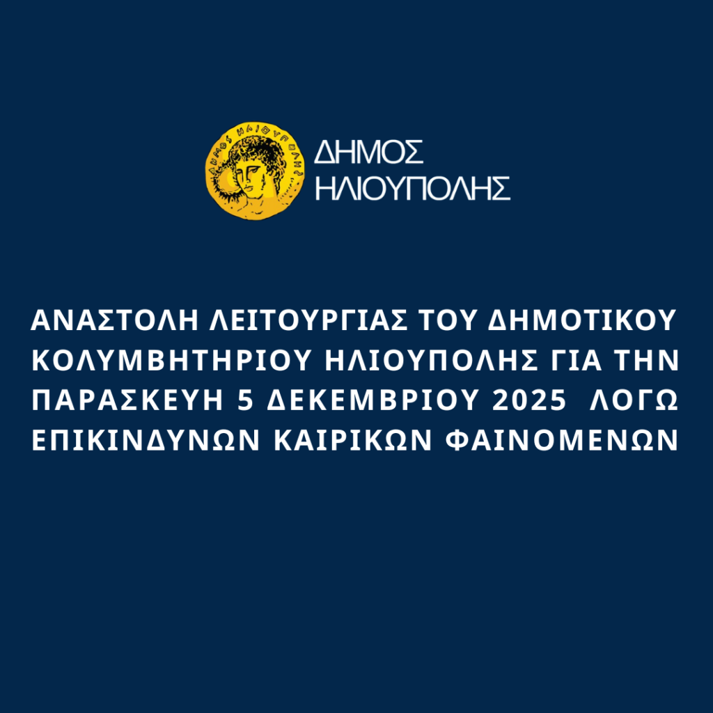 Ενημερώνουμε τους δημότες και κατοίκους ότι το Δημοτικό κολυμβητήριο Ηλιούπολης θα παραμείνει κλειστό για την Παρασκευή 5 Δεκεμβρίου 2025 λόγω επικίνδυνων καιρικών φαινομένων. Για οποιοδήποτε νεότερο σχετικά με την λειτουργία του Δημοτικού κολυμβητήριου Ηλιούπολης θα υπάρξει νέα ανακοίνωση. Ευχαριστούμε για την κατανόηση.