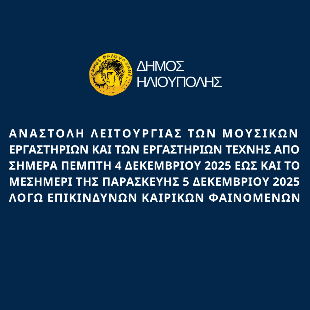 Αναστολή λειτουργίας των Μουσικών Εργαστηρίων και των Εργαστηρίων Τέχνης από σήμερα Πέμπτη 4 Δεκέμβριου 2025 έως και το μεσημέρι της Παρασκευής 5 Δεκεμβρίου 2025 λόγω επικίνδυνων καιρικών φαινομένων