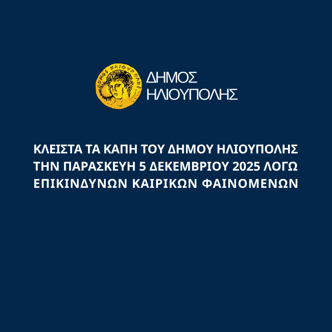 Ενημερώνουμε τους δημότες και κατοίκους ότι τα ΚΑΠΗ του Δήμου Ηλιούπολης θα παραμείνουν κλειστά την Παρασκευή 5 Δεκεμβρίου 2025 λόγω επικίνδυνων καιρικών φαινομένων.