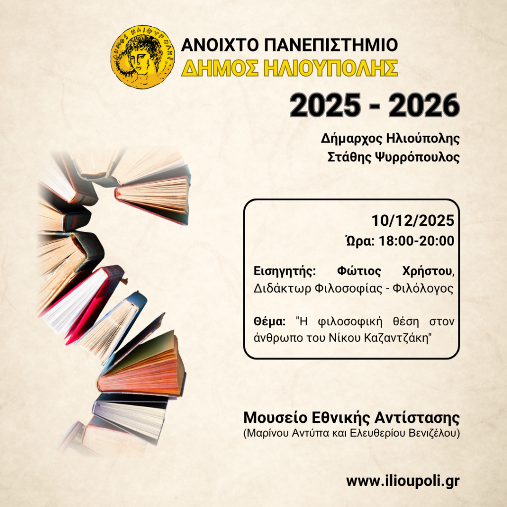 5η ομιλία του Ανοιχτού Πανεπιστημίου την Τετάρτη 10 Δεκεμβρίου 2025 και ώρα 18:00-20:00, στο Μουσείο Εθνικής Αντίστασης (Μαρίνου Αντύπα και Ελευθερίου Βενιζέλου), με Εισηγητή τον Φώτιο Χρήστου, Διδάκτωρ Φιλοσοφίας – Φιλόλογο και θέμα: «Η φιλοσοφική θέση στον άνθρωπο του Νίκου Καζαντζάκη». Η Συμμετοχή στο Ανοιχτό Πανεπιστήμιο είναι εντελώς Δωρεάν και διεξάγεται στα πλαίσια της Διά βίου Μάθησης και της Κοινωνικής […]