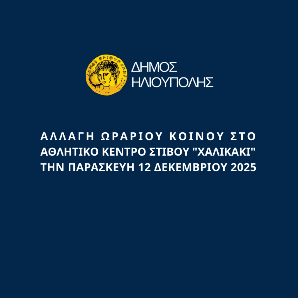 Ενημερώνουμε τους δημότες και κατοίκους ότι οι πρωινές ώρες κοινού την Παρασκευή 12 Δεκεμβρίου 2025 θα είναι από τις 7.00π.μ έως τις 8.30π.μ λόγω διεξαγωγής Σχολικών Αγώνων Στίβου των Δημοτικών Σχολείων της πόλης που θα ξεκινήσουν στις 8:30π.μ και θα ολοκληρωθούν στις 13:30μ.μ Οι υπόλοιπες ώρες κοινού θα ισχύουν κανονικά. Σας ευχαριστούμε για την κατανόηση.