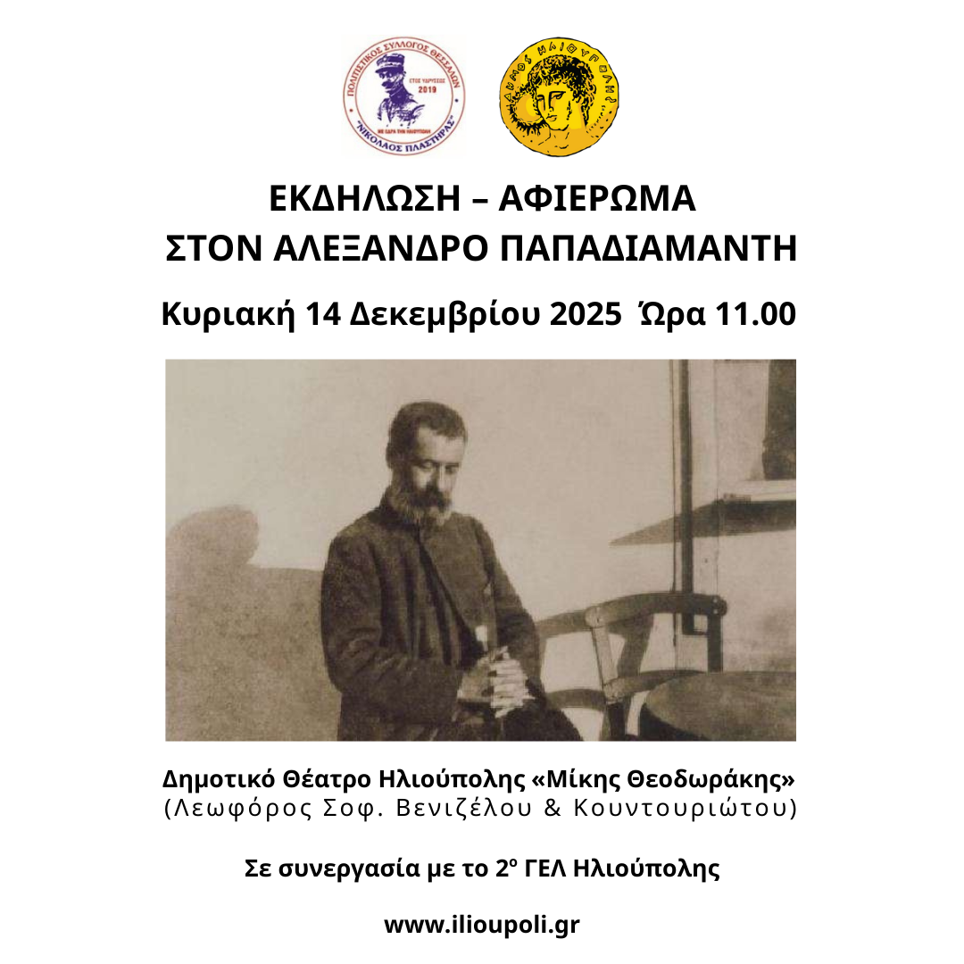 Ο Πολιτιστικός Σύλλογος Θεσσαλών Ηλιούπολης «Νικόλαος  Πλαστήρας» σε συνεργασία με το Δήμο Ηλιούπολης έχει  την τιμή να  σας προσκαλέσει στην εκδήλωση – αφιέρωμα  για  τον Αλέξανδρο  Παπαδιαμάντη, που θα γίνει  στο  Δημοτικό  Θέατρο  Ηλιούπολης   «Μίκης  Θεοδωράκης» την  Κυριακή 14 Δεκεμβρίου  2025 και ώρα  11.00,  με την συνεργασία  του 2ου ΓΕΛ   Ηλιούπολης.