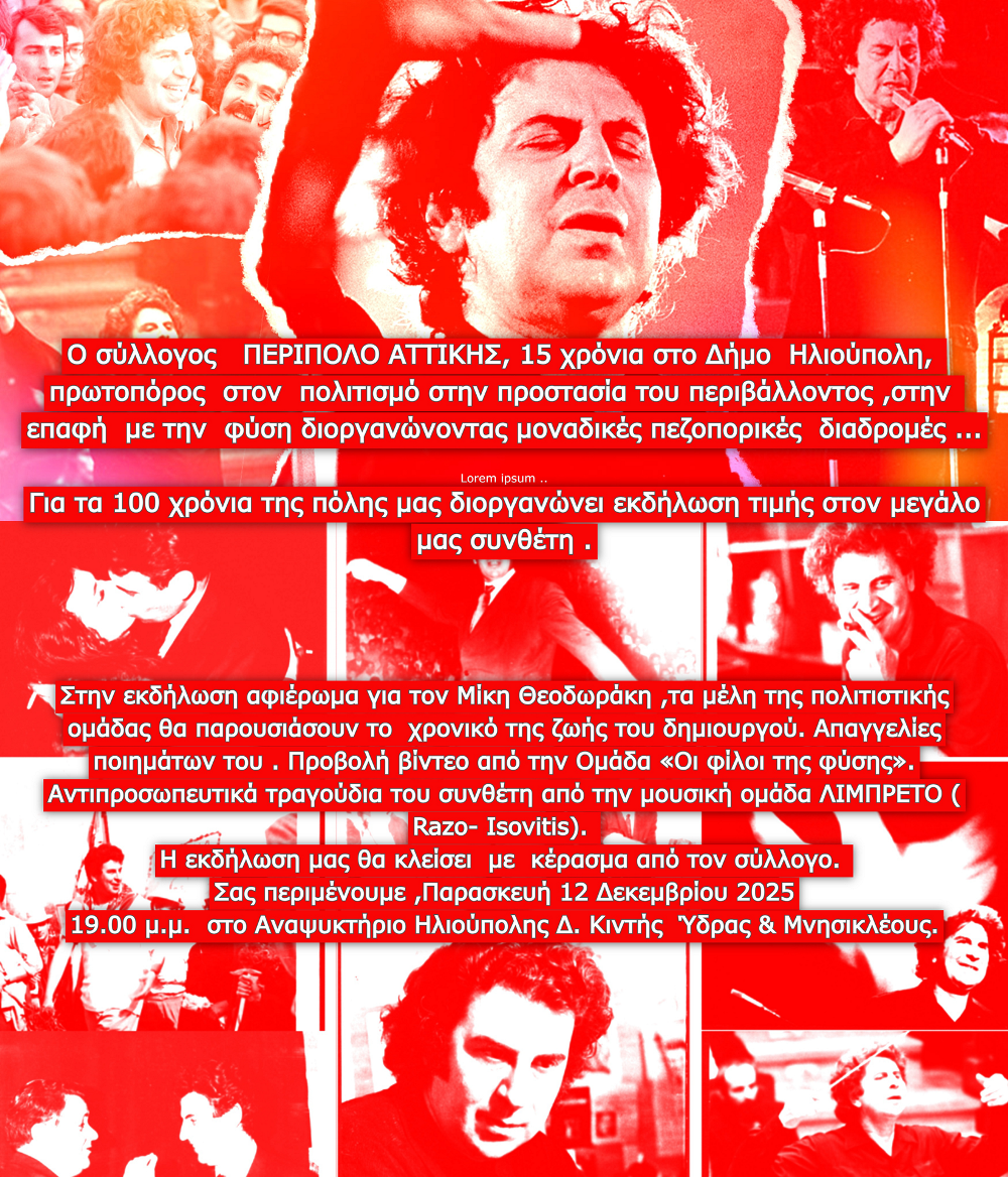 Σας  πλαίσια του εορτασμού για τα 100 χρόνια του Δήμου  Ηλιούπολης σας  καλούμε στη εκδήλωση αφιερωμένη στον μεγάλο μας συνθέτη Μ Θεοδωράκη.