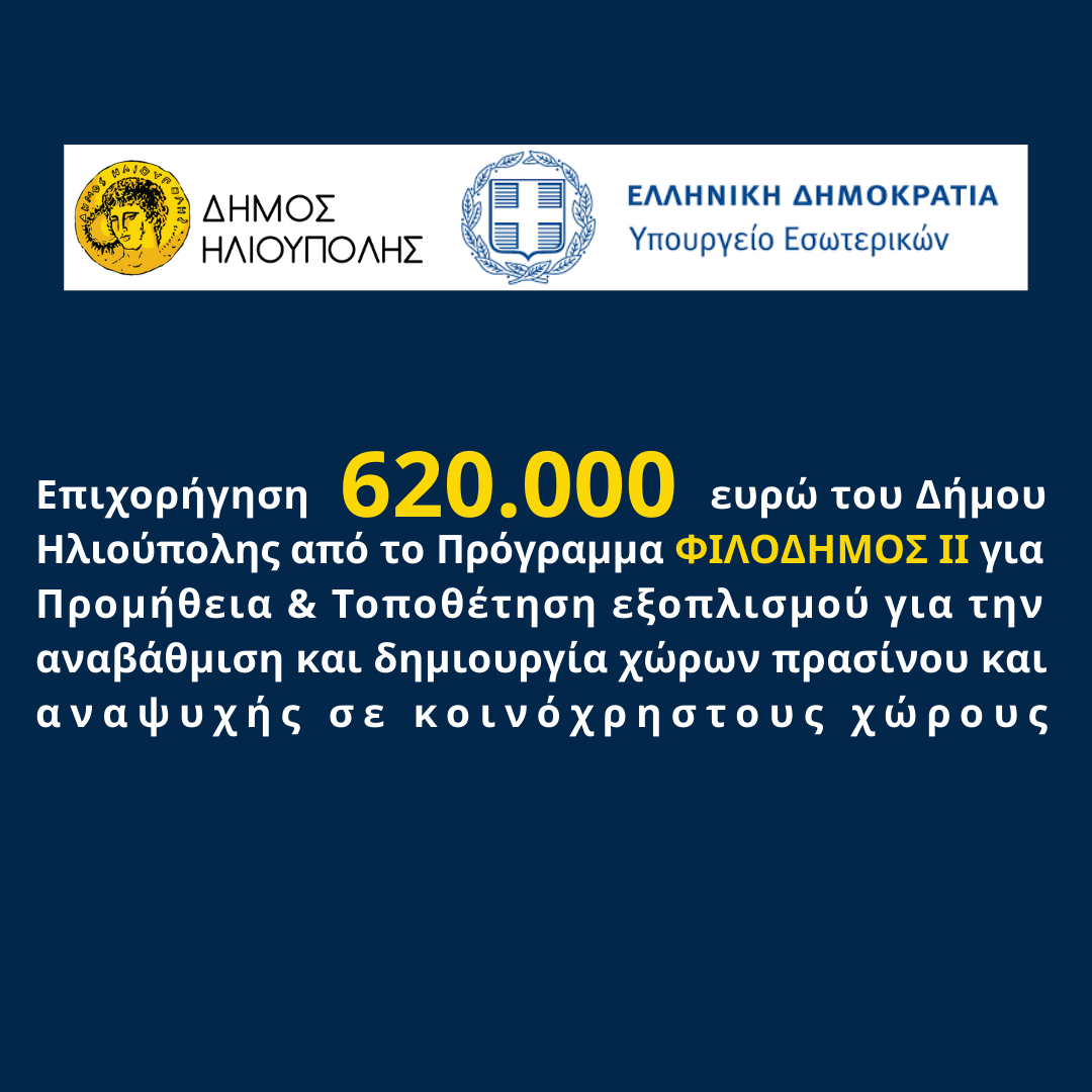 Μετά την κατάθεση σχετικής μελέτης από την Τεχνική Υπηρεσία του Δήμου Ηλιούπολης σε συνεργασία με ομάδα εργασίας που συστάθηκε γι᾽ αυτό ακριβώς τον σκοπό, εγκρίθηκε η χρηματοδότηση Επιχορήγησης 620.000 ευρώ του Δήμου Ηλιούπολης από το Πρόγραμμα ΦΙΛΟΔΗΜΟΣ ΙΙ για Προμήθεια & Τοποθέτηση εξοπλισμού για την αναβάθμιση και δημιουργία χώρων πρασίνου και αναψυχής σε κοινόχρηστους χώρους.