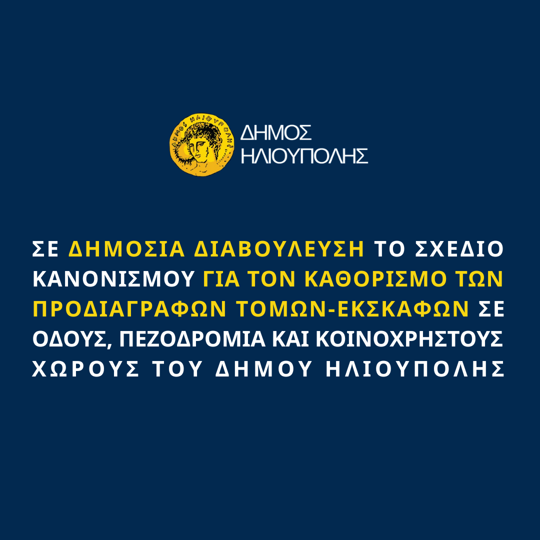 ΣΕ ΔΗΜΟΣΙΑ ΔΙΑΒΟΥΛΕΥΣΗ ΤΟ ΣΧΕΔΙΟ ΚΑΝΟΝΙΣΜΟΥ ΓΙΑ ΤΟΝ ΚΑΘΟΡΙΣΜΟ ΤΩΝ ΠΡΟΔΙΑΓΡΑΦΩΝ ΤΟΜΩΝ-ΕΚΣΚΑΦΩΝ ΣΕ ΟΔΟΥΣ, ΠΕΖΟΔΡΟΜΙΑ ΚΑΙ ΚΟΙΝΟΧΡΗΣΤΟΥΣ ΧΩΡΟΥΣ ΤΟΥ ΔΗΜΟΥ ΗΛΙΟΥΠΟΛΗΣ