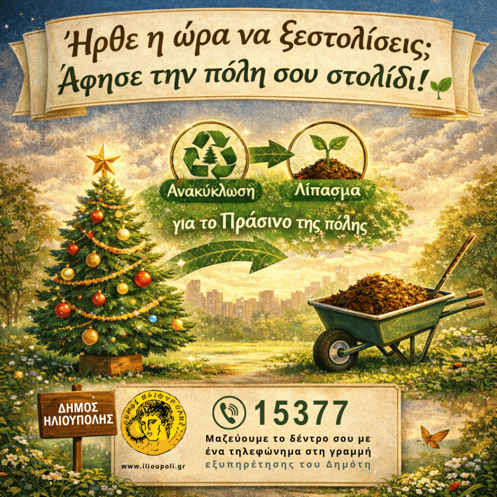 Ο Δήμος Ηλιούπολης με σεβασμό στις αρχές της Βιώσιμης Ανάπτυξης και Αειφορίας καλεί τους κατοίκους, με το πέρας της εορταστικής περιόδου, να μην απορρίπτουν τα φυσικά χριστουγεννιάτικα δέντρα στα κοινά απορρίμματα, αλλά να τα οδηγούν προς ανακύκλωση και κομποστοποίηση, συμβάλλοντας ενεργά στην προστασία του περιβάλλοντος και στη μείωση των αποβλήτων. Με ένα απλό τηλεφώνημα στη […]