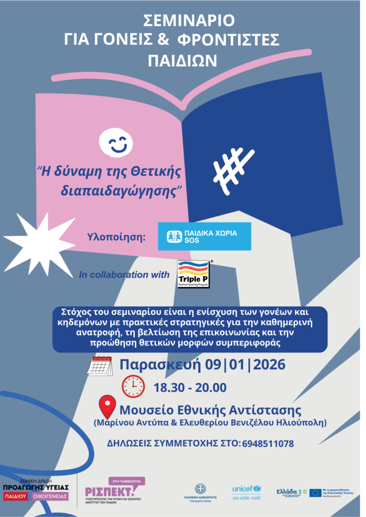Σεμινάριο από τα Παιδικά Χωριά SOS για Γονείς & Φροντιστές παιδιών στο πλαίσιο του Μνημονίου Συνεργασίας με τον Δήμο Ηλιούπολης την Παρασκευή 9 Ιανουαρίου 2026 στις 18:30 στο Μουσείο Εθνικής Αντίστασης