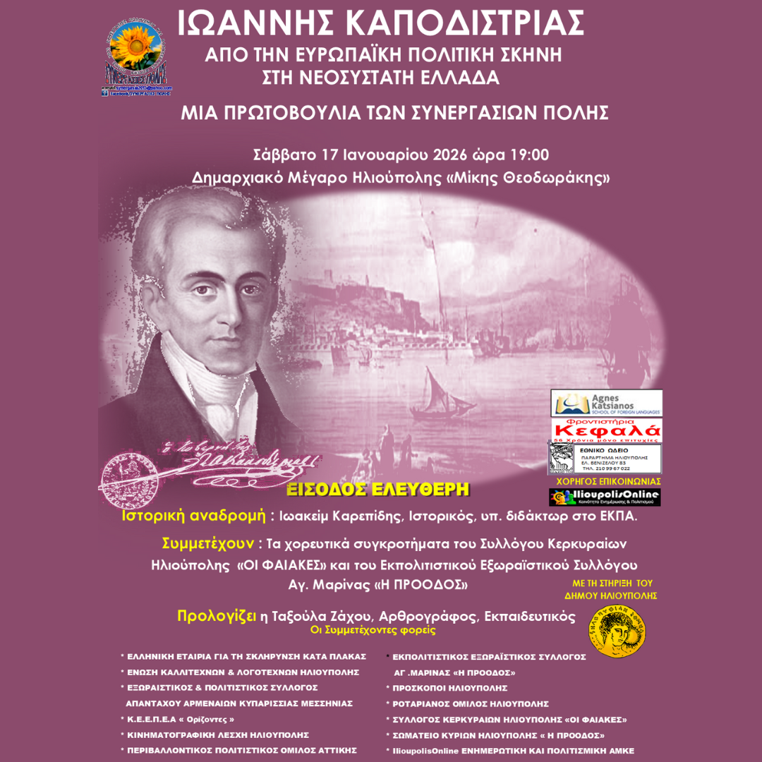 Οι «ΣΥΝΕΡΓΑΣΙΕΣ ΠΟΛΗΣ» έχουν την τιμή να σας προσκαλέσουν για να παρακολουθήσετε την εκδήλωση που διοργανώνουν με θέμα «Ιωάννης Καποδίστριας από την Ευρωπαϊκή πολιτική σκηνή στη νεοσύστατη Ελλάδα».