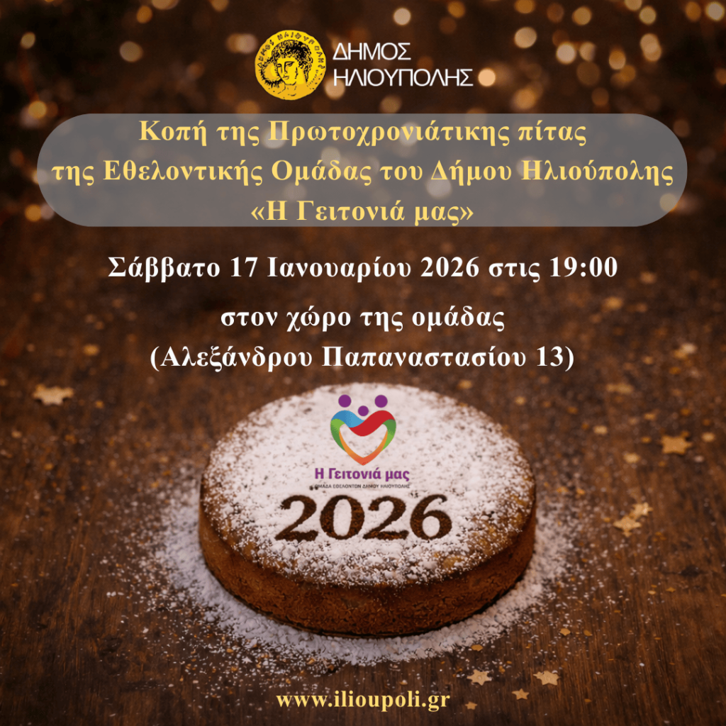 Η Εθελοντική Ομάδα του Δήμου Ηλιούπολης «Η Γειτονιά μας» προσκαλεί όλους τους Δημότες και φίλους της πόλης, καθώς και συλλόγους, φορείς, εθελοντικές ομάδες και φιλανθρωπικούς οργανισμούς, στην κοπή της πρωτοχρονιάτικης πίτας της, το Σάββατο 17 Ιανουαρίου 2026, στον χώρο της ομάδας, (Αλεξάνδρου Παπαναστασίου 13, Πολυκλαδικά Ηλιούπολης). Η προσέλευση θα ξεκινήσει στις 19:00, ενώ η κοπή της πίτας […]