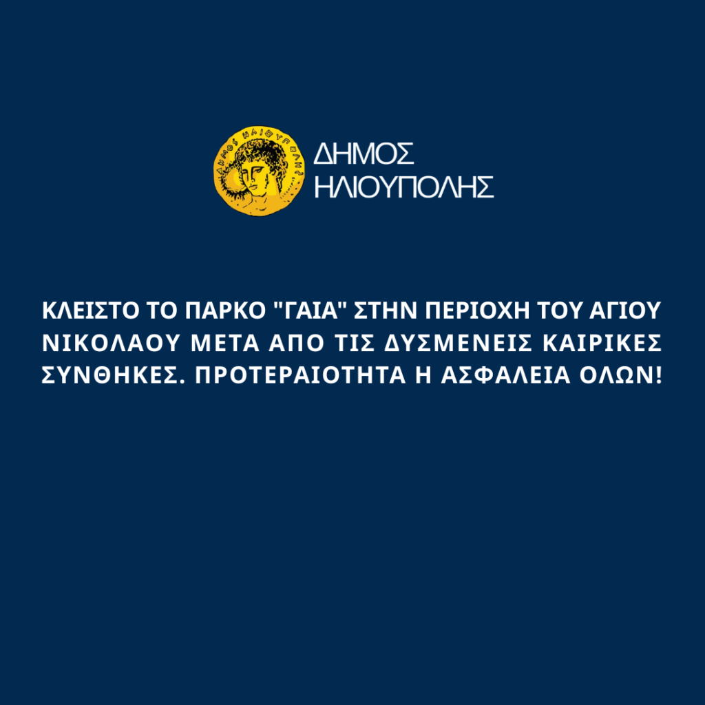 Ενημερώνουμε τους Δημότες & Κατοίκους ότι το Πάρκο “ΓΑΙΑ” στην περιοχή του Αγίου Νικολάου θα παραμείνει κλειστό για λόγους ασφαλείας από σήμερα Παρασκευή 23 Ιανουαρίου 2026 μέχρι νεωτέρας, μετά από τις δυσμενείς καιρικές συνθήκες που σημειώθηκαν την Τετάρτη 21 Ιανουαρίου 2026 και έχουν προκαλέσει σοβαρό κίνδυνο πτώσης δέντρων. Κλειστή θα παραμείνει και η παιδική χαρά […]