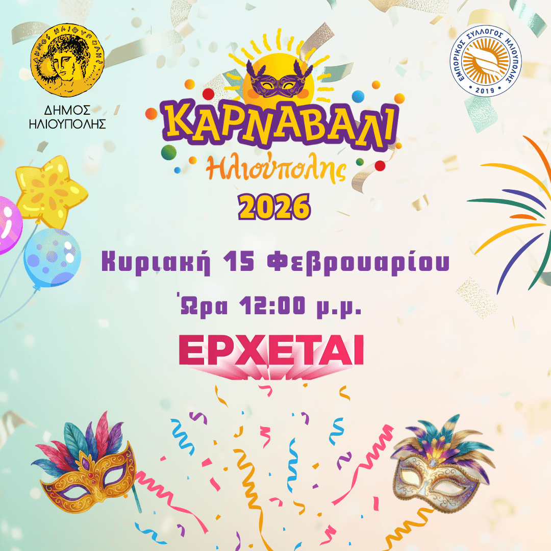 Το Καρναβάλι Ηλιούπολης έρχεται για την φετινή χρονιά στις 15 Φεβρουαρίου 2026 για να τιμήσουμε όλοι μαζί τα καρναβαλικά μας έθιμα, να διασκεδάσουμε, να έχουμε τη δυνατότητα να συμμετέχουμε σε μία μεγάλη γιορτή, όπου τον πρώτο λόγο έχουν τα παιδιά της πόλης και όσοι θέλουν να νιώσουν παιδιά!