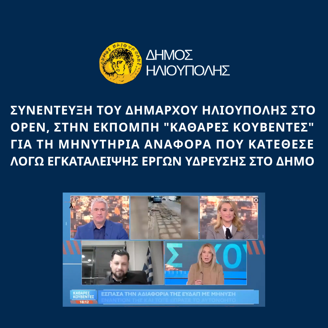 Ο Δήμαρχος Ηλιούπολης Στάθης Ψυρρόπουλος κλήθηκε σε συνέντευξη στο κανάλι OPEN και την εκπομπή “Καθαρές Κουβέντες” με τους δημοσιογράφους Σπύρο Χαριτάτο και την Αλεξάνδρα Χατζηγεωργίου για τη μηνυτήρια αναφορά που κατέθεσε απέναντι σε εργολάβους σχετικά με την εγκατάλειψη έργων ύδρευσης στο Δήμο.