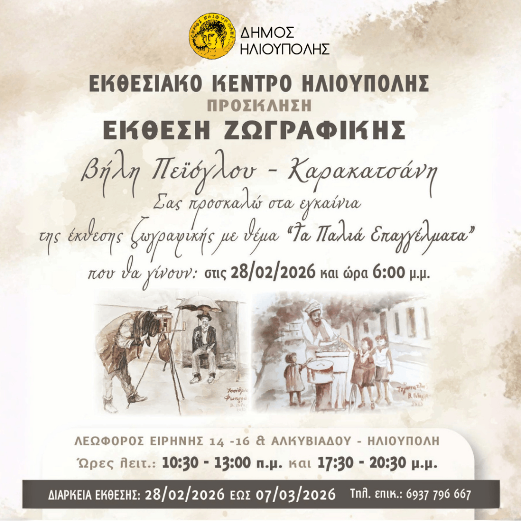 O Δήμος Ηλιούπολης έχει την τιμή να σας προσκαλέσει στην Έκθεση Ζωγραφικής της Βήλης Πεϊόγλου Καρακατσάνη με θέμα «Τα Παλιά Επαγγέλματα». Η έκθεση θα λάβει χώρα στο Εκθεσιακό Κέντρο του Δήμου Ηλιούπολης (Λεωφόρος Ειρήνης 14-16 & Αλκιβιάδου στην πλατεία Φλέμινγκ) από το Σάββατο 28 Φεβρουάριου 2026 έως το Σάββατο 7 Μαρτίου 2026, καθημερινά 10:00 έως 13:00 […]