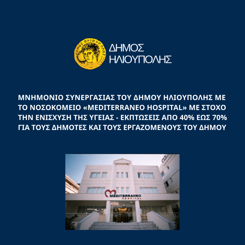 ΜΝΗΜΟΝΙΟ ΣΥΝΕΡΓΑΣΙΑΣ ΤΟΥ ΔΗΜΟΥ ΗΛΙΟΥΠΟΛΗΣ ΜΕ ΤΟ ΝΟΣΟΚΟΜΕΙΟ «MEDITERRANEO HOSPITAL» ΜΕ ΣΤΟΧΟ ΤΗΝ ΕΝΙΣΧΥΣΗ ΤΗΣ ΥΓΕΙΑΣ – ΕΚΠΤΩΣΕΙΣ ΑΠΟ 40% ΕΩΣ 70% ΓΙΑ ΤΟΥΣ ΔΗΜΟΤΕΣ ΚΑΙ ΤΟΥΣ ΕΡΓΑΖΟΜΕΝΟΥΣ ΤΟΥ ΔΗΜΟΥ