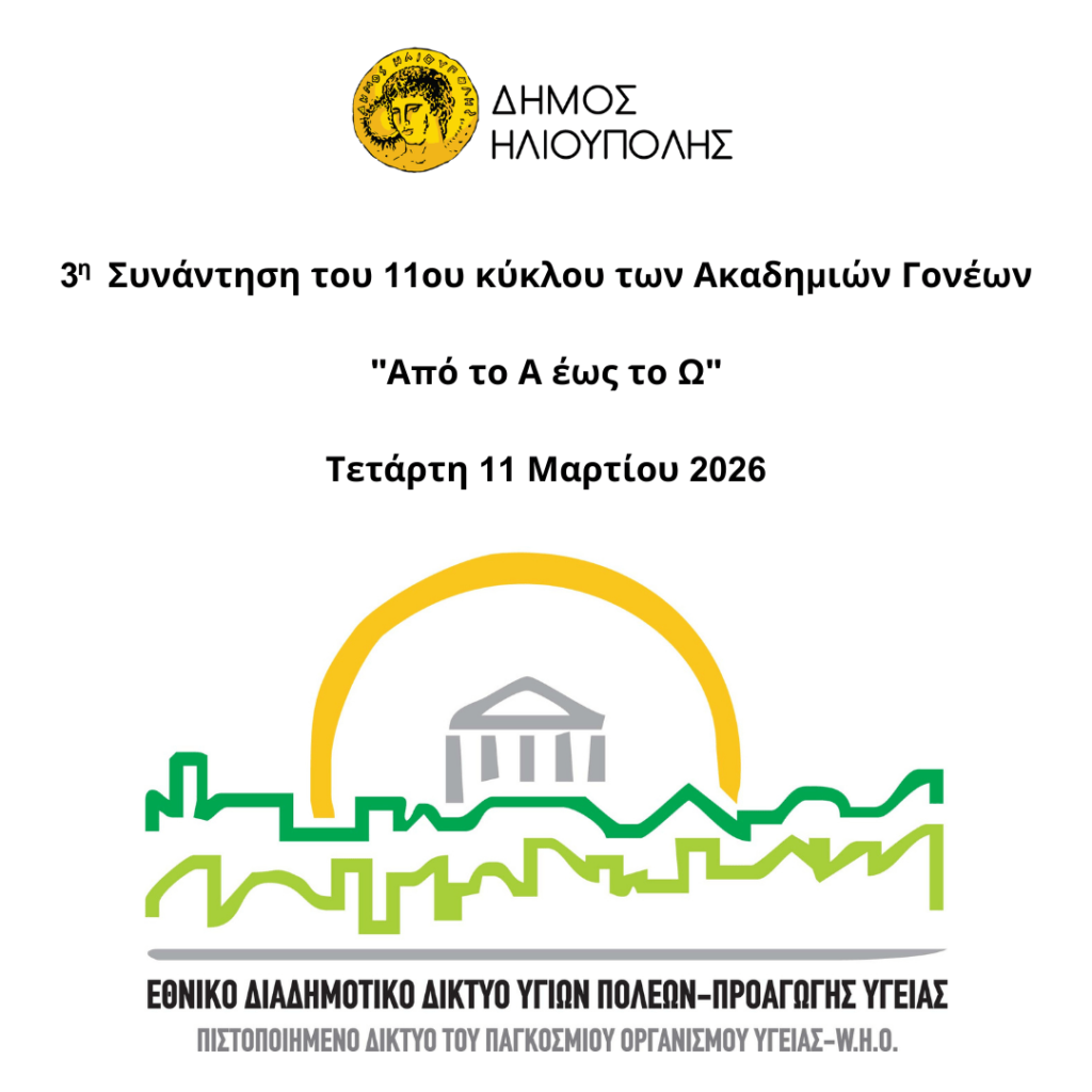 O Δήμος Ηλιούπολης και το Ελληνικό Διαδημοτικό Δίκτυο Υγιών Πόλεων (ΕΔΔΥΠΠΥ) του Π.Ο.Υ. σας καλούν να παρακολουθήσετε το πρόγραμμα της 3ης Συνάντησης της Ακαδημίας Γονέων που θα πραγματοποιηθεί την Τετάρτη 11 Μαρτίου 2026 και ώρα 18:15. Ο 11ος κύκλος των Ακαδημιών Γονέων «Από το Α έως το Ω : μια Ακαδημία για Γονείς» πραγματοποιείται από το ΠΜΣ «Στρατηγικές Αναπτυξιακής και Εφηβικής Υγείας» […]