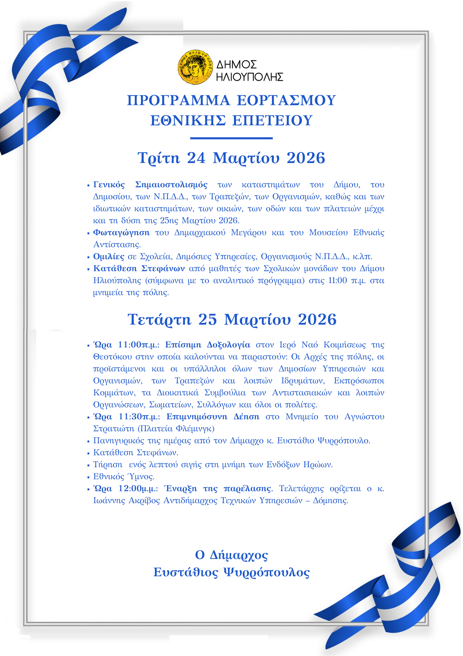 Πρόσκληση Δημάρχου κ. Ευστάθιου Ψυρρόπουλου για την 25η Μαρτίου 2026