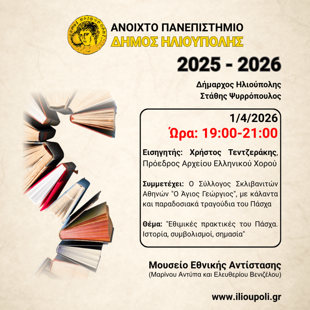 Επίκαιρη ομιλία στο Ανοιχτό Πανεπιστήμιο την Τετάρτη 1η Απριλίου με θέμα: «Εθιμικές πρακτικές του Πάσχα. Ιστορία, συμβολισμοί, σημασία».