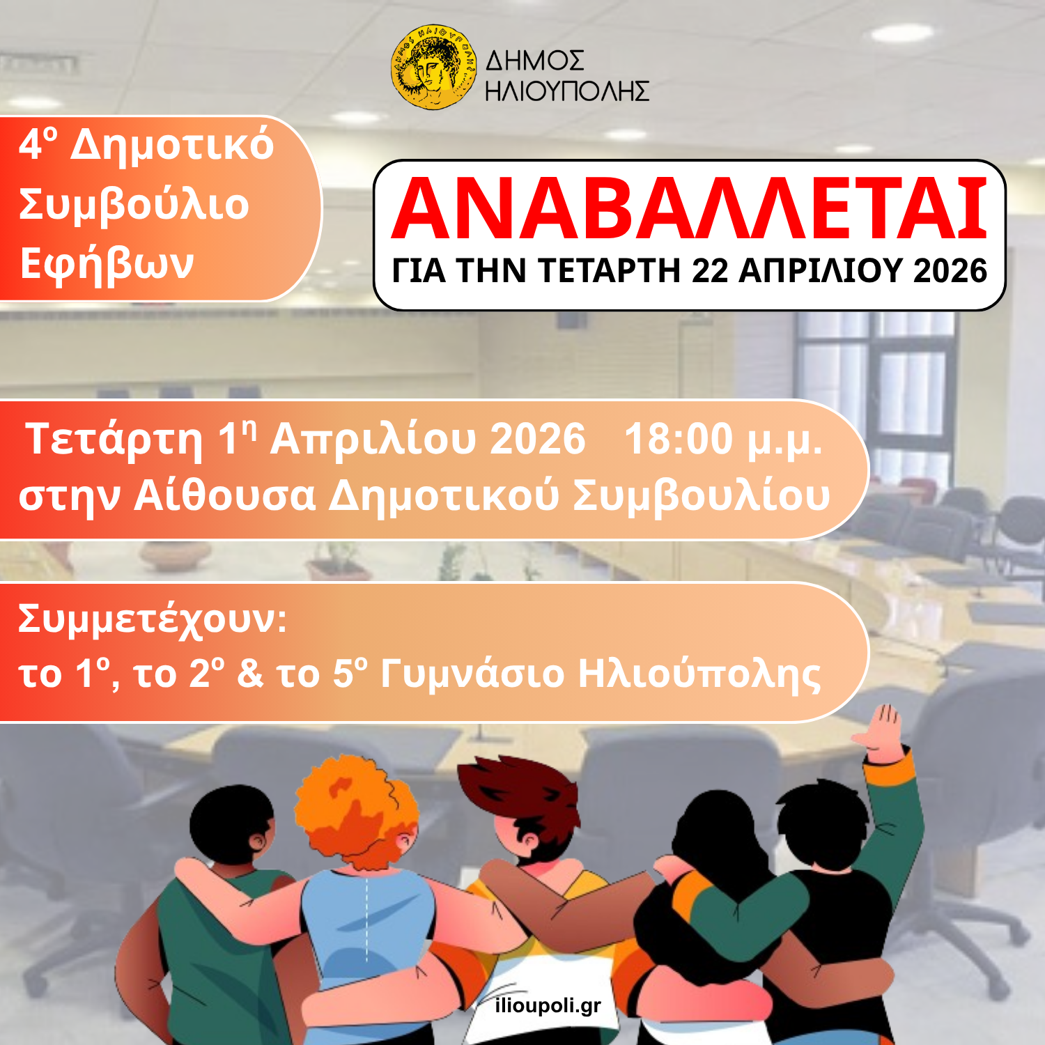Ενημερώνουμε τους δημότες και κατοίκους ότι το Δημοτικό Συμβούλιο εφήβων αναβάλλεται λόγω των επικίνδυνων επερχόμενων καιρικών φαινομένων για την Τετάρτη 22 Απριλίου 2026.