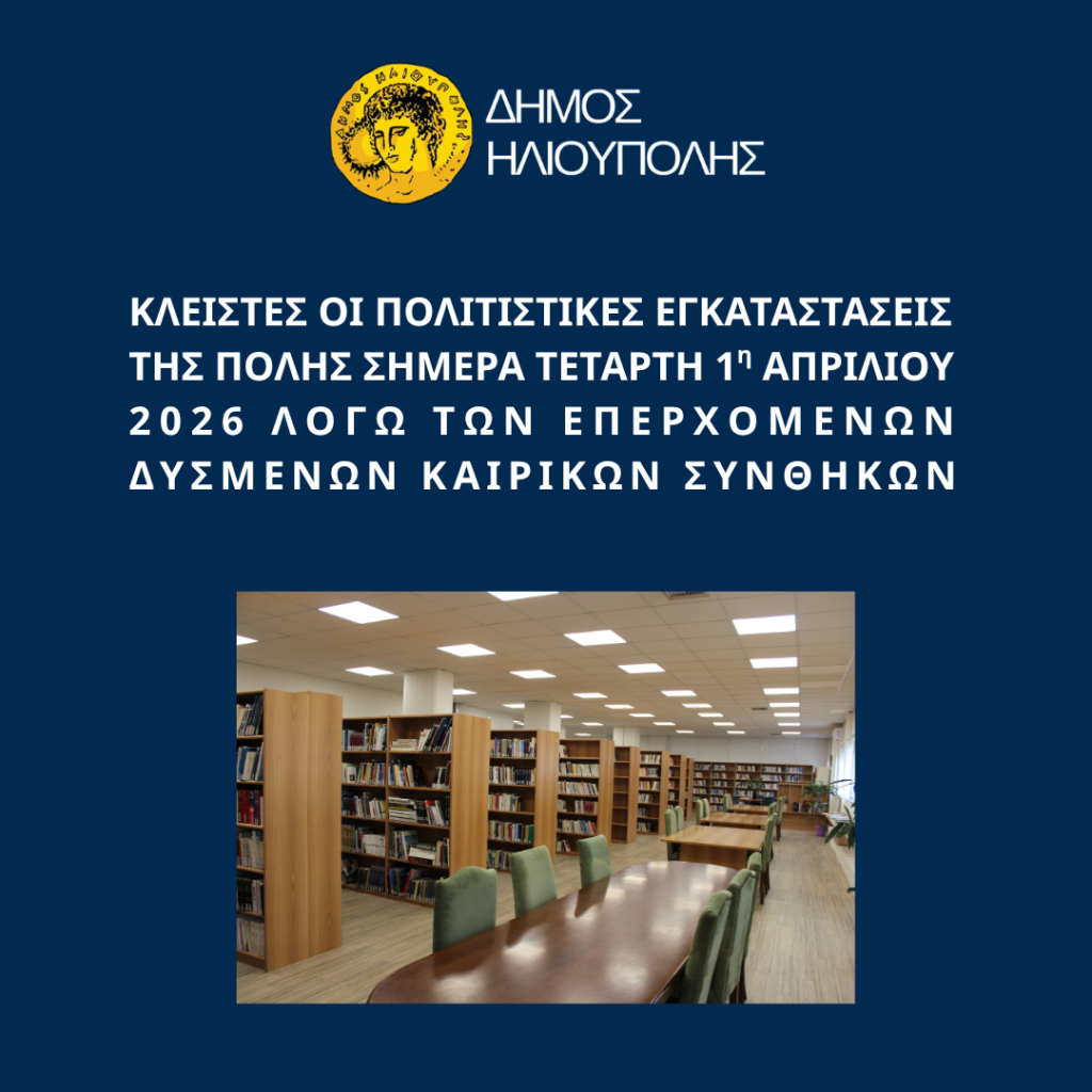 Ενημερώνουμε τους Δημότες & Κατοίκους ότι οι πολιτιστικές εγκαταστάσεις του Δήμου Ηλιούπολης (Δημοτική Βιβλιοθήκη, Εργαστήρια Τέχνης και Μουσικά Εργαστήρια) θα παραμείνουν κλειστές σήμερα Τετάρτη 1η Απριλίου 2026 από τις 15:00 μ.μ., λόγω επικίνδυνων καιρικών φαινομένων. Η προστασία όλων παραμένει προτεραιότητα προκειμένου να παραμείνουμε ασφαλείς.