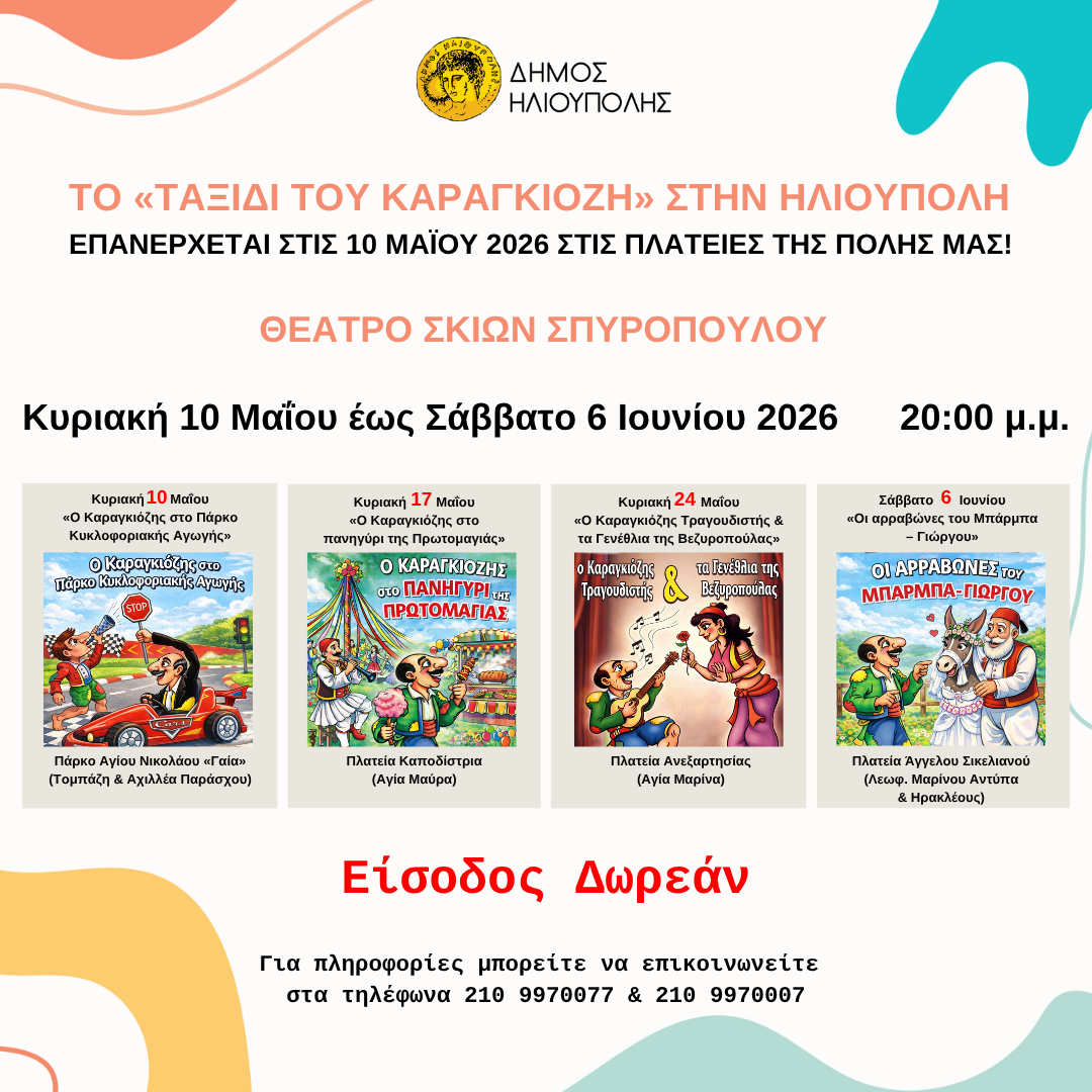 Το «Ταξίδι του Καραγκιόζη» στην Ηλιούπολη για τους μικρούς και μεγάλους φίλους ξεκινάει την Κυριακή 10 Μαΐου 2026 και ολοκληρώνεται το Σάββατο 6 Ιουνίου 2026.