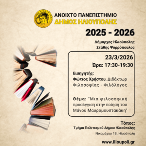 Επιπλέον διάλεξη του Ανοικτού Πανεπιστημίου την Δευτέρα 23 Μαρτίου 2026 στο Κτίριο Πολιτισμού του Δήμου Ηλιούπολης
