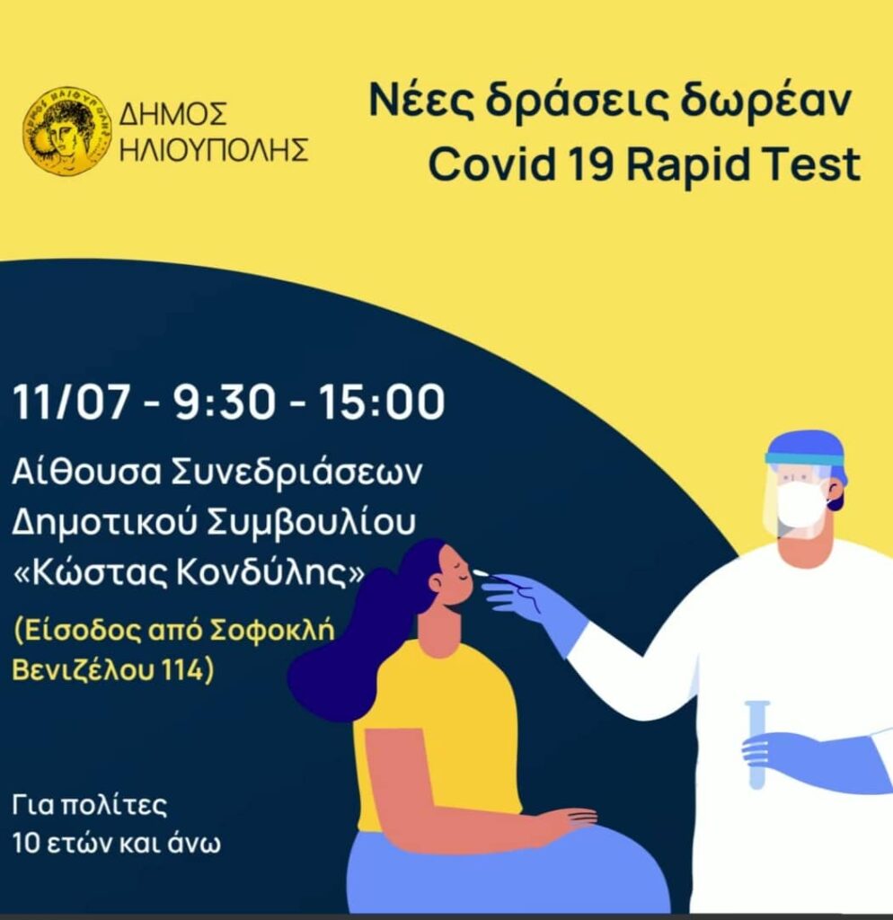 ΝΕΕΣ ΔΡΑΣΕΙΣ ΔΩΡΕΑΝ COVID-19 RAPID TEST ΣΤΟ ΔΗΜΑΡΧΕΙΟ ΗΛΙΟΥΠΟΛΗΣ ΓΙΑ ΤΟΝ ΜΗΝΑ ΙΟΥΛΙΟ