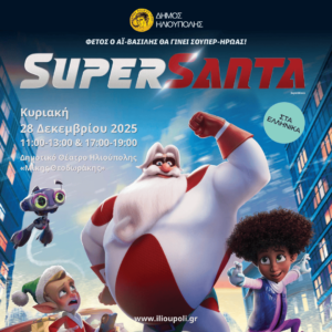 Την Κυριακή 28 Δεκεμβρίου 2025 ο Δήμος Ηλιούπολης έχει την χαρά να σας προσκαλέσει σε μία διπλή παιδική προβολή όπου ο Άγιος Βασίλης γίνεται Super