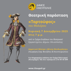 Το Θεατρικό Εργαστήρι του Δήμου Ηλιούπολης μας προσκαλεί την Κυριακή, 7 Δεκεμβρίου, στις 7 μ.μ., στο Δημοτικό Θέατρο «Μίκης Θεοδωράκης», (Λεωφόρος Σοφ. Βενιζέλου & Κουντουριώτου),