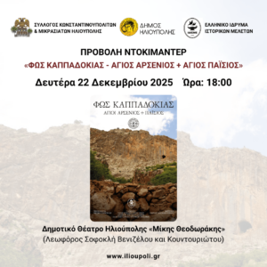 Προβολή του Ντοκιμαντέρ «ΦΩΣ ΚΑΠΠΑΔΟΚΙΑΣ – ΑΓΙΟΣ ΑΡΣΕΝΙΟΣ + ΑΓΙΟΣ ΠΑΪΣΙΟΣ» στο Δημοτικό Θέατρο Ηλιούπολης «Μίκης Θεοδωράκης» τη Δευτέρα 22 Δεκεμβρίου 2025 στις 18:00
