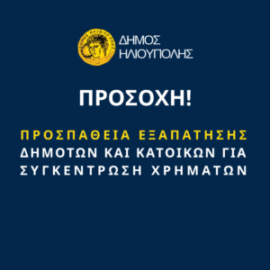 Ενημερώνουμε τους Δημότες και Κατοίκους Ηλιούπολης ότι διενεργείται από σήμερα το πρωί, Πέμπτη 18 Δεκεμβρίου 2025 προσπάθεια εξαπάτησης Δημοτών και Κατοίκων Ηλιούπολης για δήθεν συγκέντρωση