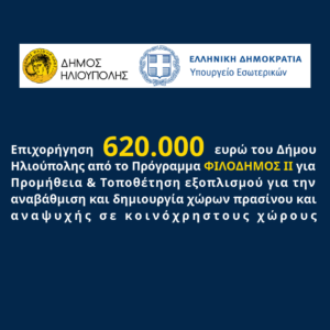 Εγκρίθηκε Επιχορήγηση 620.000 ευρώ του Δήμου Ηλιούπολης από το Πρόγραμμα ΦΙΛΟΔΗΜΟΣ ΙΙ για Προμήθεια & Τοποθέτηση εξοπλισμού για την αναβάθμιση και δημιουργία χώρων πρασίνου και αναψυχής σε κοινόχρηστους χώρους.